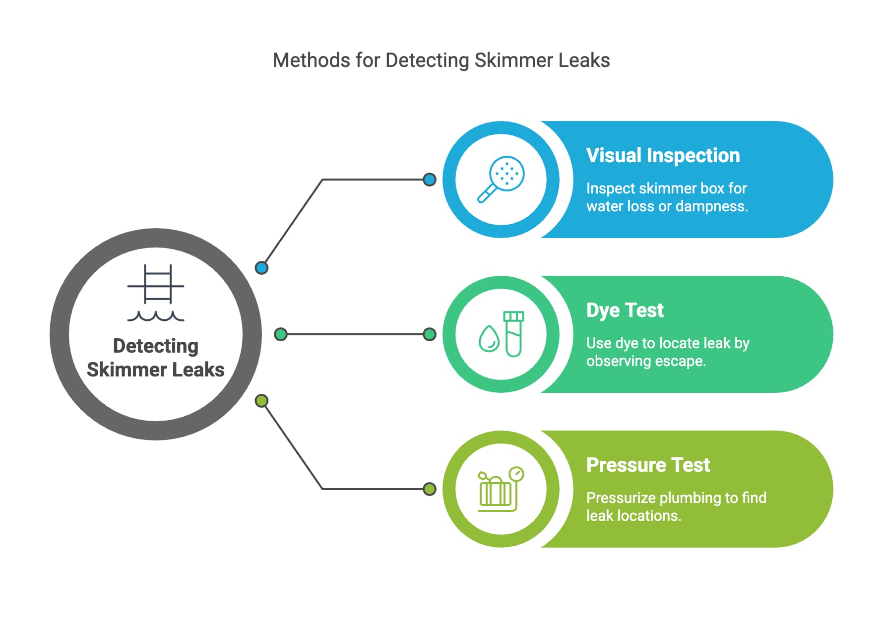 Detecting a skimmer leak involves a combination of visual inspection and specialized tests. Start by visually inspecting the skimmer box and surrounding areas for signs of water loss or dampness. If you suspect a leak, conducting a dye test can help pinpoint its location. This involves adding dye to the pool water near the suspected leak area and observing if the dye escapes.