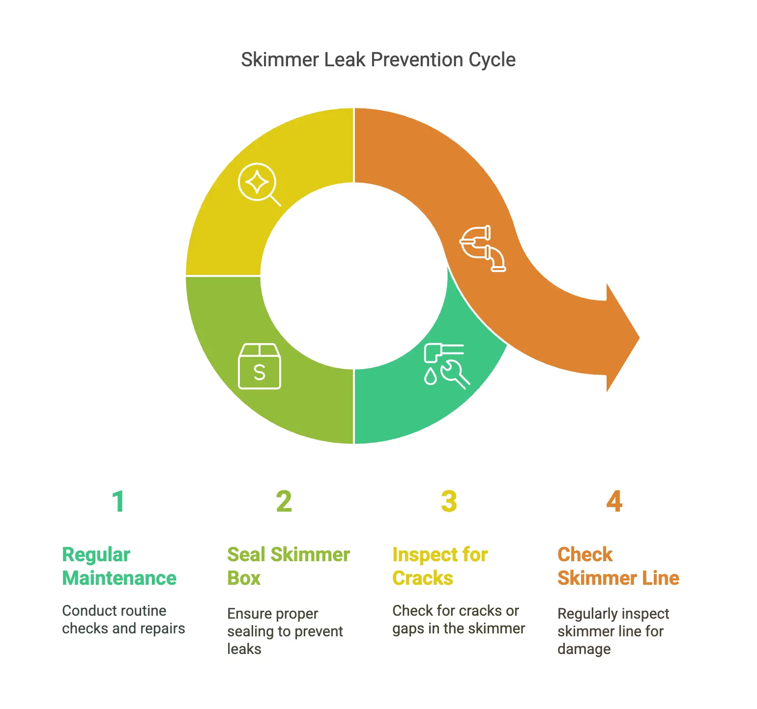 Preventing future leaks around the skimmer involves regular maintenance and inspections. Ensure that the skimmer box is properly sealed and that there are no cracks or gaps where the skimmer meets the concrete. Regularly checking the skimmer line for damage can also help prevent leaks.